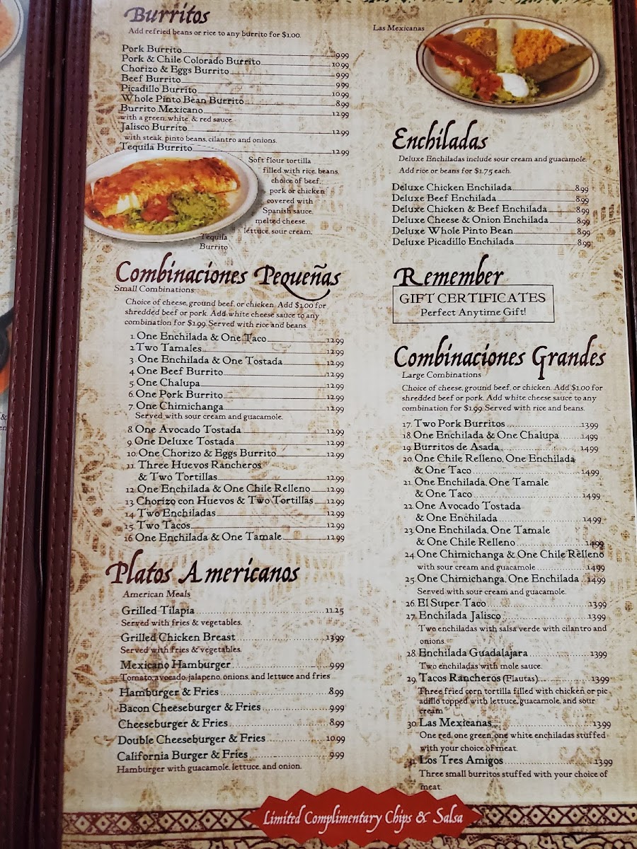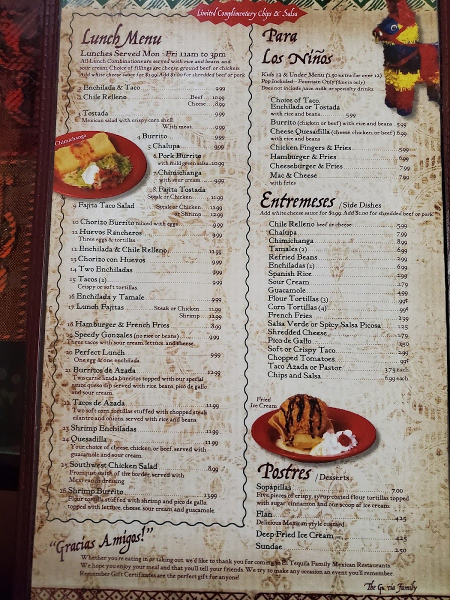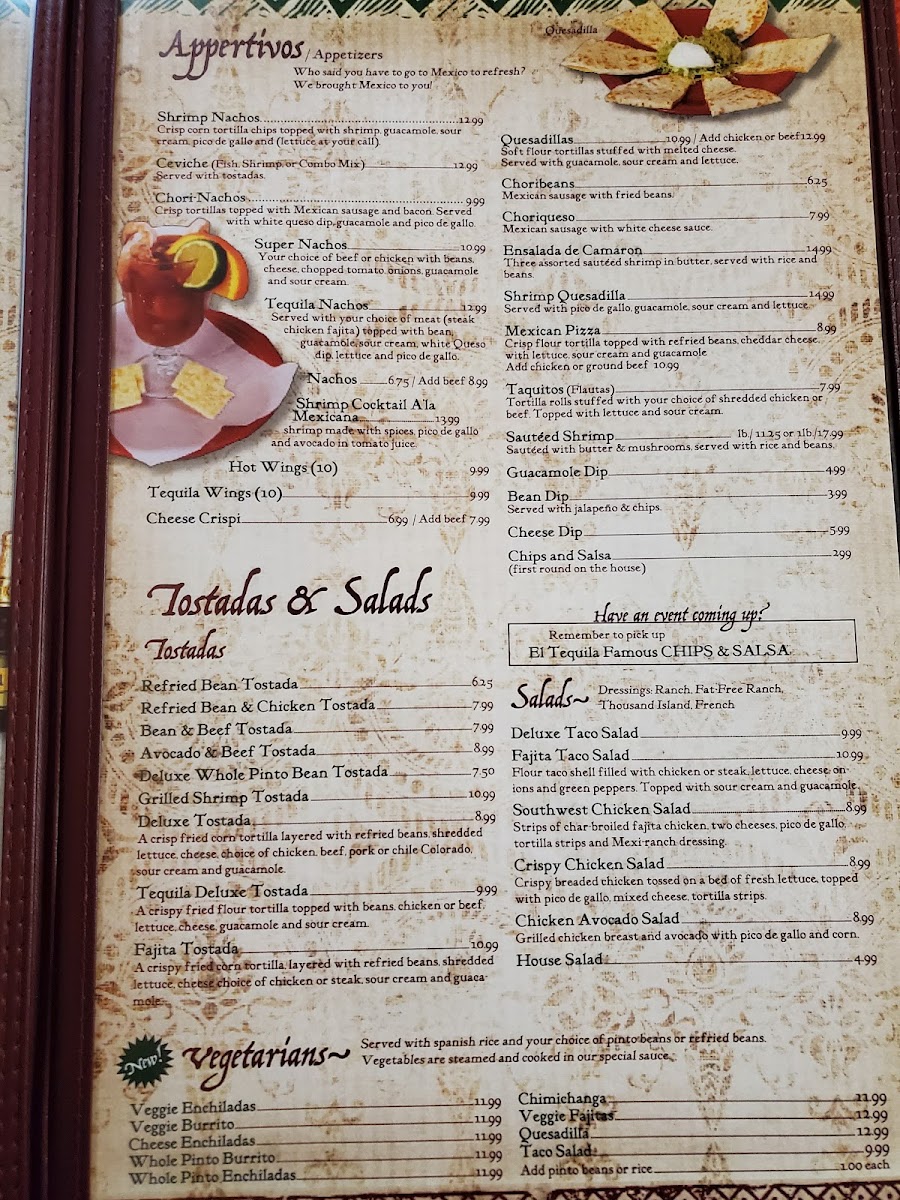 As you step inside, you’ll be greeted by a warm atmosphere, adorned with charming décor. Diners appreciate the speedy service and the welcoming staff, making every visit feel special. Savor the fresh table salsa and indulge in creamy cheese and bean dips that perfectly complement your meal. Whether you're craving hearty chimichangas or flavorful enchiladas, El Tequila promises delicious dining experiences, every time.